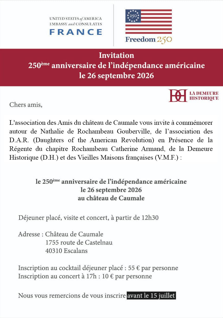le 250eme anniversaire de l'indépendance américaine le 26 septembre 2026 au château de Caumale